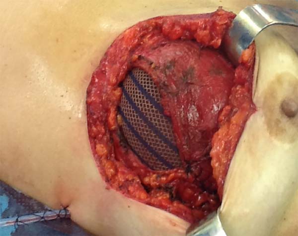 Nos casos das reconstruções secundárias, a técnica sofreu pequenas alterações em um caso, no qual não havia cobertura muscular suficiente. Assim, uma vez que o músculo peitoral maior havia sido seccionado na cirurgia primária, a tela foi suturada em sua porção inferolateral no músculo serrátil anterior e na aponeurose do musculo reto abdominal e superiormente na pequena porção de músculo peitoral maior remanescente (Figura 4). Capsulotomia ou capsulectomia também foram realizadas nesses casos.