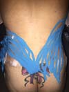 The intraoperative treatment of the EG group was performed with the application of lymphatic taping in a “fan” or “octopus” form in the operated regions. The dressings were cut into five different portions, positioned with minimum tension (0-15%) in the regions of the abdomen (with a fixed base in the axillary region bilaterally) (Figure 1) and flanks (with a fixed base in the coccygeal region) (Figure 2) and contention foam 360° in the operated region under the surgical mesh (Figure 3). The same postoperative treatment was offered to patients in the EG and CG.