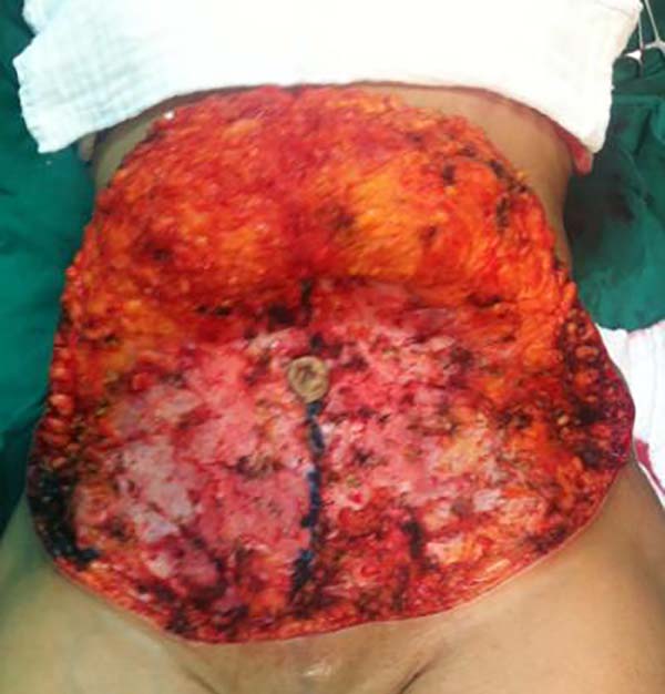 Todos os procedimentos foram realizados com bloqueio peridural e sedação venosa pelo anestesista da equipe. Após a assepsia, iniciamos a cirurgia com bisturi de lâmina 15 na pele e seguimos com o descolamento do retalho abdominal com bisturi elétrico. O descolamento se estende até a cicatriz umbilical, sendo o umbigo isolado com bisturi lâmina 15 em forma arredondada (Figura 2).