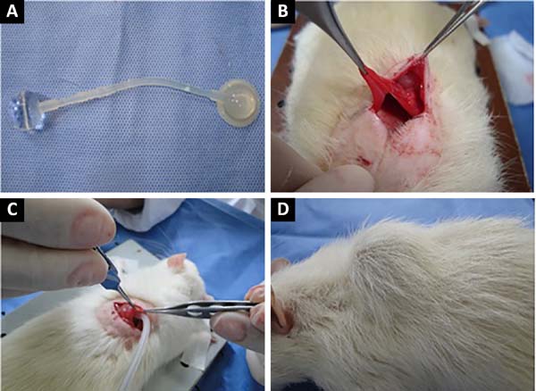 Foram utilizadas dez ratas com peso médio de 300 g, com cerca de 6 meses da cepa Wistar (Rattus norvegicus). O músculo utilizado para a expansão foi o grande dorsal, por ser de fácil abordagem, delgado, com evidente plano de clivagem e base óssea subjacente. Para a expansão muscular, foram utilizados expansores de órbita de seres humanos com 1,7 cm de diâmetro, 3 ml de volume, lisos, com duas válvulas, esterilizados com óxido de etileno, registrados na Agência Nacional de Vigilância Sanitária (ANVISA) (Figura 1A).