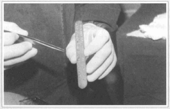 lines it is necessary to use a magnifying glass. The donator area and all prepared grafts must be holded under small sterile wood sticks such as disposable tongue depressors, frequently humidified with saline solution spray but never immersed in it. Surgical procedure can be facilitated and dynamized by a rigorous control of each graft's quality and the side-by-side disposal of the grafts in the sticks, in a position that makes the surgeon's assistant's movements easier for the introduction of the grafts in the receptor site (Fig. 2c).