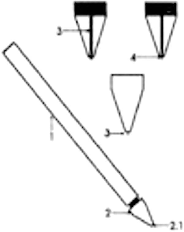 The surgical marking pen (Figure 7) is used in superficial surgeries to demarcate the area to be operated. It is composed of a rod (1) and a marker tip (2). This tip has an inner orifice (2.1) into which appropriate graphite can be inserted (3), whose main characteristic is to produce an accurate and fixed marking on human skin to perfectly demarcate the area that will undergo incision, or even marker tip; in this case, there is a cone needle (4) that, when pressed against the skin, will release microquantities of ink, filling the space previously occupied by the graphite and marking the area with the same efficiency.