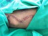 ICF, sexo masculino, negro, 22 anos, estudante, nega etilismo, tabagismo. Admitido no Serviço público do Hospital Santo Amaro com queixa de dor e edema em axila MSD, ao exame físico apresentava hidradenite bilateral em membros superiores, porém MSD apresentando sinais flogístico de infeção local edemaciado, hiperemiado, com presença de secreção purulenta espessa com loja e fistula, foi classificado no score Hurley com Classificação III com presença cicatrizes e lesões da hidradenite conforme pode ser visualizado na figura 1. Passou por procedimento cirúrgico de hidradenite bilateral em janeiro de 2019 outro serviço. Em março do mesmo ano evoluiu para recidiva em axila direta com sinais flogísticos presença de pouca secreção iniciado antibioticoterapia com Sulfametoxazol® e Trimetropim® sem resposta satisfatória. Paciente passou por 2º procedimento cirúrgico de ressecção complementar. Ao final de maio do mesmo ano paciente retorna com início de flogose local sem secreção. Solicitado exames laboratoriais sem sinais de infecção sistêmica, prescrito antibioticoterapia, Ciprofloxacino® por 14 dias, havendo melhora. Em meados de junho do mesmo ano apresentou supuração sendo internado por um dia para realização da 3º intervenção cirúrgica, ressecção total ampla da hidradenite em MSD região axilar com rotação de retalho fasciocutâneo toraco lateral anterior como pode ser visualizado na figura 2 e finalizado com sutura e colocação de dreno penrose conforme pode ser visualizado na figura 4, curativo e antibioticoterapia com Ciprofloxacino® e Clindamicina® em pós operatório por 7 dias. A peça resseccionada com local lesionado por hidradenite pode ser visualizada na figura 3. O dreno apresentou debito serohematico baixo. Sem novas queixas. No 5º pós operatório apresentou discreto seroma, drenado 5 ml de líquido seroso. No acompanhamento aos15 dias pode ser visualizar cicatriz limpa seca em figura 5. Após alta hospitalar o cliente foi acompanhado 7, 15 e 30 dias sem intercorrências.