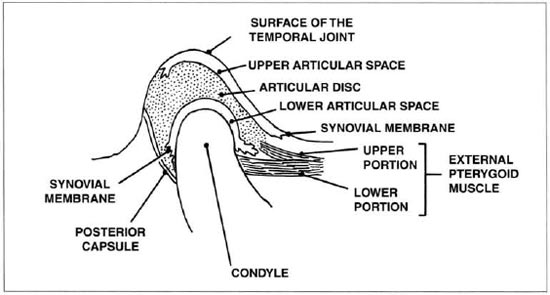 Fig. 1 - Drawing representing TMJ. Note the external pterygoid muscle with its 2 heads: one to pull the disc and another for the condyle.