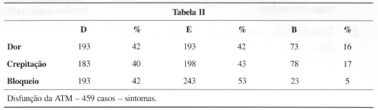 Paralelamente, foi realizada pesquisa em 100 casos consecutivos, em indivíduos sem qualquer sintomatologia dolorosa da ATM, e verificou-se que em 35% destes "normais" havia alguma forma de disfunção da ATM, o que vem a confirmar o trabalho de Costa(15) (ver quadros de I a V).