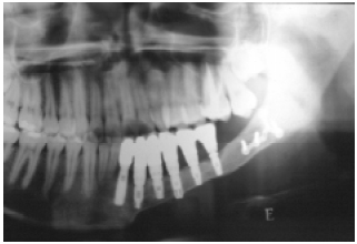 Após a reconstrução óssea da mandíbula, observamos os pacientes por um período de 1 ano a fim de avaliar a integração dos implantes ósseo-integrados pelo segmento ósseo reconstituído. Os implantes foram colocados pela equipe do Serviço de Cirurgia Buco-maxilo-facial da instituição citada anteriormente (Figuras 4 a 8).