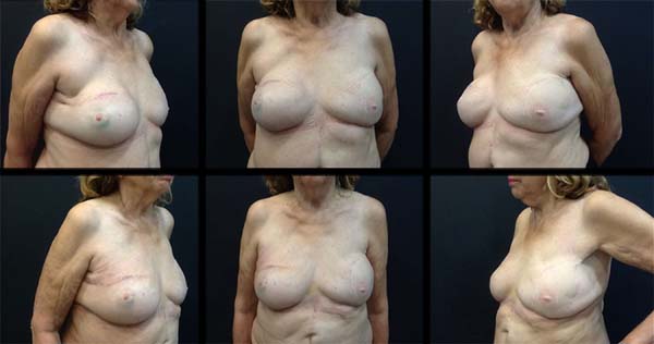 Case 2. Elderly woman who had late breast reconstruction on the right with an ipsilateral rectus abdominis muscle flap. She was dissatisfied with the result obtained due to asymmetry between the breasts. The prosthesis was replaced by a 350 mL expander. After six months, this expander was replaced by an anatomical silicone prosthesis of the same volume and a 332 mL prosthesis with the same profile was placed in the left breast. Fat grafting of 120 mL was used to correct small asymmetries and residual deformities. Edema, pain and mild initial hyperemia disappeared after 15 to 30 days. The patient was satisfied with the result obtained and presented no complications during outpatient follow-up (Figure 2).