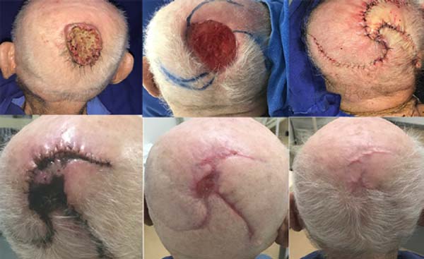 Foram feitos 21 retalhos que incluíram técnica de Limberg, bilobado, bandeira, retalho glabelar (Rieger), nasogeniano e retalho triplo em catavento de couro cabeludo. As Figuras 2 a 4 mostram resultados de alguns desses casos de reconstrução mais complexos.