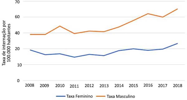 Conclusão: Houve aumento na taxa de internação geral. O sexo masculino apresentou taxas