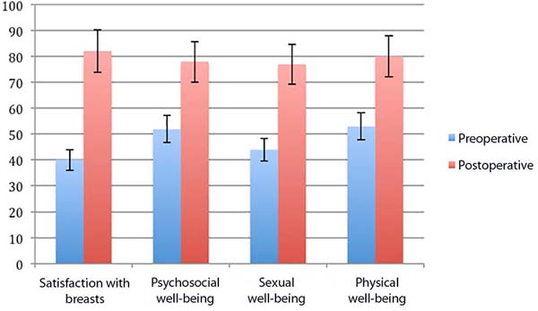 Figure 1 illustrates the scores of the Breast-Q® questionnaires before and after surgery.