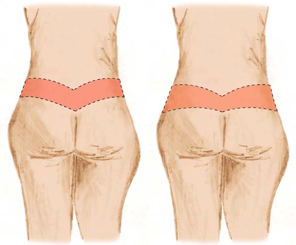Nos primeiros casos operados - grupo A - a cicatriz posterior era posicionada mais superiormente, na região do dorso. Isto promovia o acinturamento do tronco, porém tornava-se difícil cobrir a cicatriz com os trajes de banho. Nesta época, houve deiscência parcial da cicatriz posterior sobre o cóccix em alguns pacientes, causadas pela tensão excessiva sobre a cicatriz neste ponto, pois as incisões posteriores eram paralelas. Desde então, diminuiu-se a distância entre as linhas de demarcação posterior na área sobre o cóccix. Com isso, essa intercorrência tornou-se pouco frequente (Figura 4).