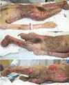 Paciente do sexo masculino, 18 anos, sem comorbidades, vítima de colisão com caminhão, seguida de explosão de tanque de gasolina de sua moto, apresentava queimadura predominantemente de 3º grau com superfície corpórea queimada (SCQ) estimada de 50% em membros inferiores, abdome, dorso inferior e antebraço esquerdo, e queimaduras de 2º grau superficial em antebraço direito (Figura 1).