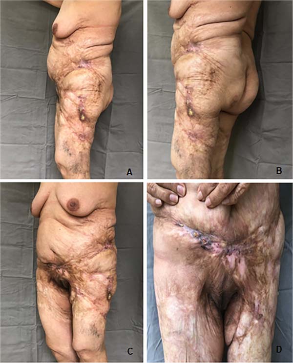 Na região de abdome inferior, optou-se pela realização de tratamento das sequelas de queimadura em conjunto com a ressecção de fibrose cicatricial e das áreas de calcinose com rotação de retalho dermogorduroso de abdome superior. Já na região lateral de coxa esquerda, optou-se por enxertia de pele total proveniente do retalho abdominal (Figuras 1 a 5).