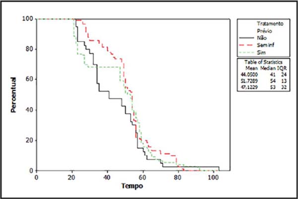Em 43% das lesões, já havia sido tentado algum tratamento prévio sem sucesso, e em 41% das vezes isto não foi possível de determinar. Utilizando o estimador de Kaplan-Meier, não foi observada diferença estatística para se completar o esquema de radioterapia naqueles que realizaram ou não outros tratamentos previamente (Figura 6).