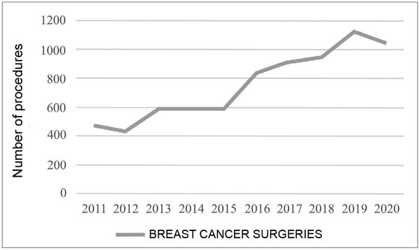 Regarding the year in which breast surgeries were performed, an increase in the number of procedures was noted throughout the decade. 2020 showed a slight reduction in surgeries compared to the previous year (Figure 1).