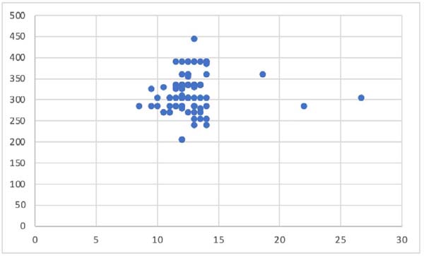 Considering complications in general, of those who did not have comorbidities, 19.6% had complications; of those who had, 50.0% showed a much higher percentage for those with comorbidities. A higher incidence of postoperative complications was observed in patients with longer surgical time (p=0.005). There was no relationship between the type of prosthesis surface and the incidence of complications (p=0.06). There was also no relationship between the access route for placing the prosthesis and the incidence of postoperative complications (p=0.12). The type of prosthesis placement also did not influence the incidence of postoperative complications (p=0.84). There was no relationship between surgical time and the incidence of complications (p=0.03). There was no association between the breast base’s size and the chosen implant’s volume (p=0.43), as shown in Graph 1 below.