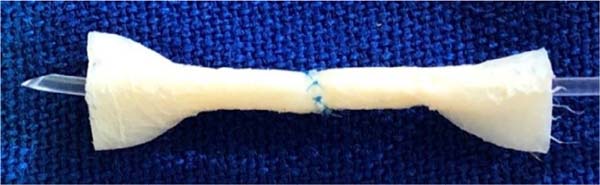 Uma das vantagens da utilização do material excedente do “ patch ” de pericárdio bovino é justamente a capacidade de o mesmo mimetizar as camadas concêntricas do tecido vascular. Ao aplicar as microssuturas nesse material, existe o risco de delaminação ou descolamento da camada íntima, quando a sutura transfixa parcialmente a espessura da parede do material. Deve-se ter o cuidado de abranger toda a espessura da parede do pericárdio bovino ao realizar a aplicação das suturas durante o treino da anastomose término-terminal, devendo-se atentar também para manter a parede posterior livre e não suturá-la junto com os pontos da linha de anastomose anterior, para que se mantenha a anastomose pérvia ( Figura 6 ).