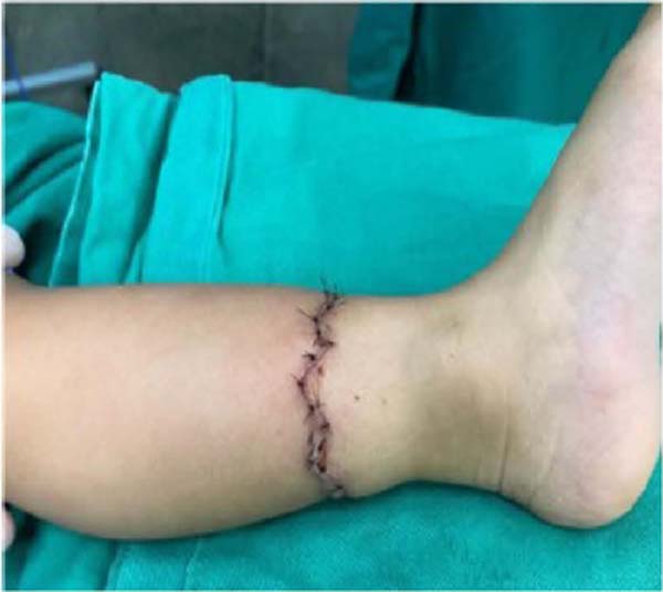 No pós-operatório (PO) imediato, a paciente evoluiu com ferida operatória íntegra, sem tensão no membro e com a região distal à ferida bem perfundida (Figura 3). Recebeu alta hospitalar no 1º dia do PO, sem queixas, sendo orientado retorno ambulatorial após três dias.