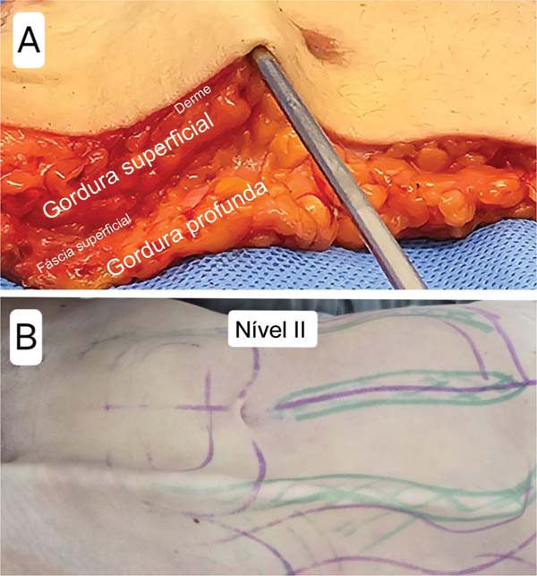 Quanto ao nível de profundidade da lipoaspiração, , o nível I é abaixo da fáscia superficial, onde há mais redução volumétrica, e menos remodelagem do contorno, e é por isso que começamos a lipoaspiração nesse plano mais profundo. O nível II é a lipoaspiração acima da fáscia superficial, onde há mais remodelagem do contorno e requer mais cuidado para evitar irregularidades. O nível III envolve a lipoaspiração realizada mais próxima da derme, tomando cuidado para deixar os orifícios da cânulavoltados para baixo para evitar maior trauma à parte profunda da derme, o que poderia causar retrações exageradas, discromias, dor, entre outros. Esse tipo de lipoaspiração, realizada para definição, foi descrita originalmente por Mentz26 e melhorada por Hoyos,27 e tem sido amplamente utilizada por vários cirurgiões plásticos e também contestada por outros.