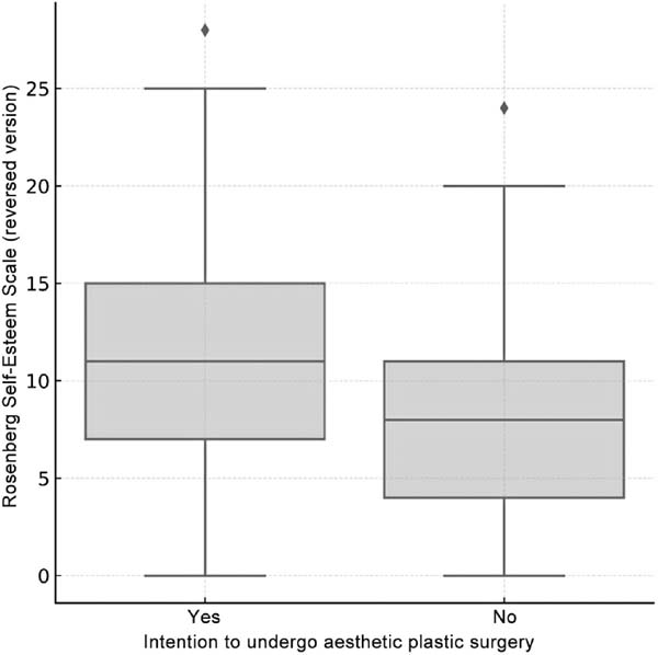 Fig. 1 - Comparison of self-esteem scores between participants with and without intention to undergo aesthetic plastic surgery. We used the reversed version of the Rosenberg Self-Esteem Scale, in which higher scores indicate lower self-esteem. The group with surgical intention had significantly lower self-esteem (p < 0.001). Source: The authors.