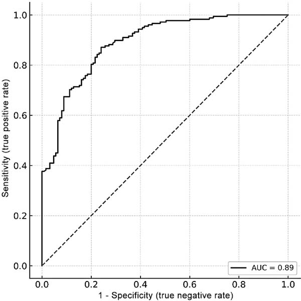 Fig. 3 - Receiver operating characteristic (ROC) curve of the adjusted logistic regression model. The area under the curve (AUC = 0.89) indicates excellent predictive performance in identifying the inten-tion to undergo aesthetic plastic surgery. The dashed line represents a random model (with no discriminative power). Source: The authors.