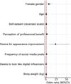 Fig. 2 - Forest plot of multiple logistic regression showing factors associated with intention to undergo aesthetic plastic surgery. Eight variables were included: gender, age, self-esteem (reversed scale), perceived professional benefit, desire to improve appearance, fre-quency of social media posts, desire to look like digital influencers, and body weight. The vertical dotted line represents an odds ratio (OR) value of 1 (no effect). Abbreviation: CI, confidence interval.