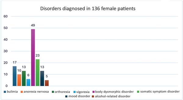 Among the 136 women with some mental condition, we identified body dysmorphic disorder (n ¼ 49 patients), so-matic symptom disorder (n ¼ 23 patients), bulimia nervosa (n ¼ 17 patients), orthorexia (n ¼ 13 patients), mood disor-der (n ¼ 13 patients), anorexia nervosa (n ¼ 10 patients), muscle dysmorphia (n ¼ 6 patients), and alcohol-related disorder (n ¼ 5 patients) (►Fig. 3).