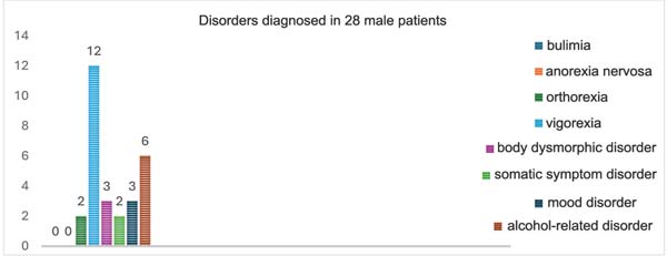 Regarding the 28 male patients with some mental condi-tion, we identified muscle dysmorphia (n ¼ 12 patients), alcohol-related disorder (n ¼ 6 patients), body dysmorphic disorder (n ¼ 3 patients), mood disorder (n ¼ 3 patients), orthorexia (n ¼ 2 patients), and somatic symptom disorder (n ¼ 2 patients). No male patients presented with bulimia nervosa or anorexia nervosa (►Fig. 4).