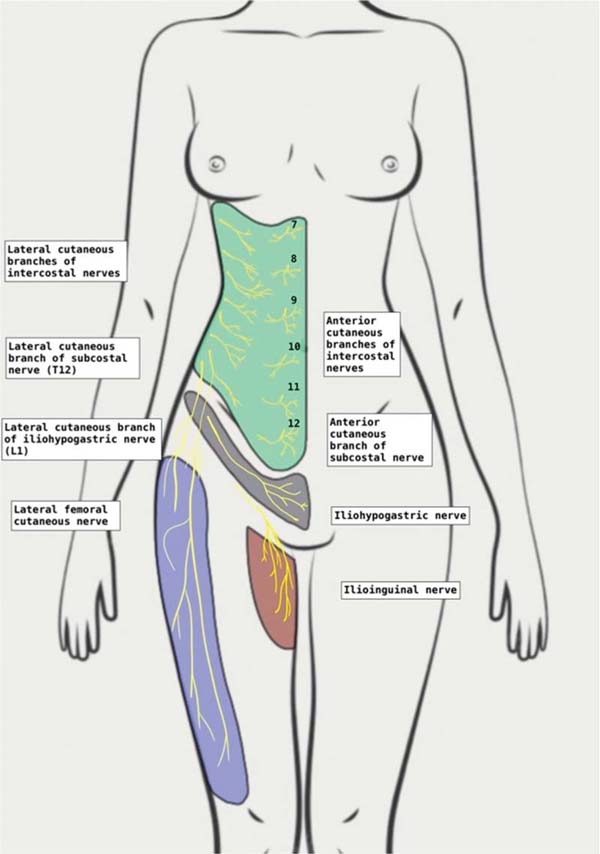 Lateral femoral cutaneous nerve (L2–L3) Although primarily a nerve of the thigh, the lateral femoral cutaneous nerve is of relevance during abdominal surgeries, as it courses near the anterior superior iliac spine. It provides sensory innervation to the skin of the lateral thigh and is at risk of injury during lower abdominal wall surgeries. This nerve is particularly vulnerable during surgical incision or retraction. Damage to this nerve can result inmeralgia paresthetica, which is characterized by pain, numbness, or burning sensations along the anterolateral thigh. It is the nerve most commonly injured after abdominoplasty.