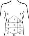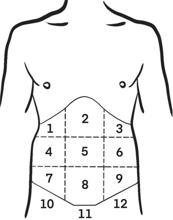 Fig. 3 - Abdomen divided into 12 areas: 1–right hypochondrium; 2–epigastric; 3–left hypochondrium; 4–right lumbar; 5–supraumbilical; 6–left lumbar; 7–right iliac; 8–infraumbilical; 9–left iliac; 10–right infraincisional; 11–midline infraincisional; and 12–left infraincisional.