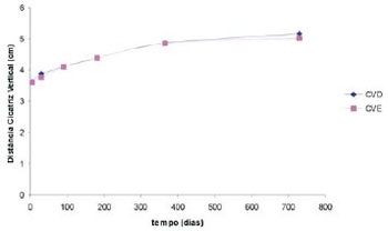Figura 4 - Medidas (em cm) da cicatriz vertical (CV) das mamas direita (D) e esquerda (E) ao longo do tempo (em dias).