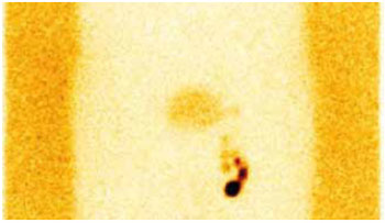 Figura 2 - Cintilografia evidenciando migração do marcador injetado no pé esquerdo para três linfonodos na região inguinal esquerda.