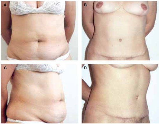 Figura 9 - A: Pré-operatório de abdominoplastia. Visão frontal. B: Pós-operatório de abdominoplastia. Visão frontal. C: Pré-operatório de abdominoplastia. Visão lateral direita. D: Pós-operatório de abdominoplastia. Visão lateral direita.
