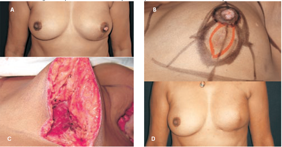 Figura 1 - Paciente de 60 anos com carcinoma ductal infiltrante em mama direita. A - Pré-operatório da quadrantectomia súperolateral. B - Marcação da ressecção de pele em vermelho e, em azul, projeção topográfica para pesquisa do linfonodo sentinela. C - Intra-operatório do defeito gerado pela retirada do tumor. D - Pós-operatório tardio de 15 meses da reconstrução com retalho de preenchimento de base inferior e mastoplastia.