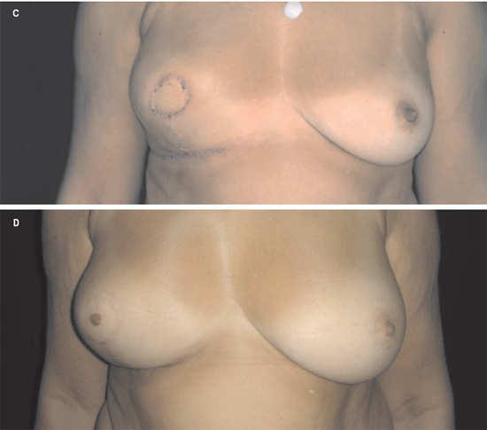 Figura 5 - Paciente de 46 anos com carcinoma ductal infiltrante em mama direita. A - Pré-operatório da quadrantectomia súpero-medial. B - Pré-operatório em visão oblíqua com a projeção da área de ressecção tumoral. C - Pós-operatório de nove meses da reconstrução com retalho em ilha (plug-flap) e mastoplastia de simetrização. D - Pós-operatório em visão oblíqua.