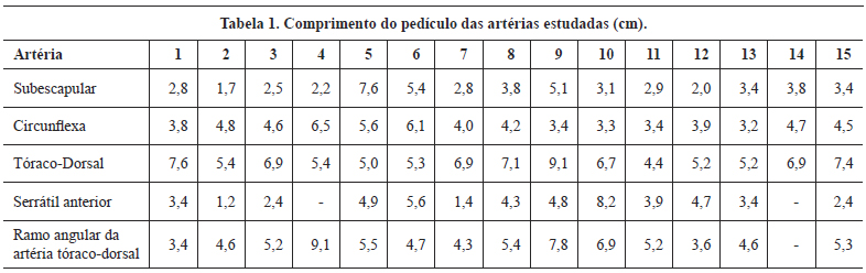 O comprimento da artéria subescapular foi medido da emergência da artéria axilar até o início da artéria circunflexa da escápula. A artéria circunflexa da escápula foi medida de seu início na artéria circunflexa da escápula até a borda lateral da escápula. A artéria tóraco-dorsal foi medida desde a bifurcação da artéria subescapular em artéria circunflexa da escápula e tóraco-dorsal até a eminência da artéria do serrátil anterior ou do ramo angular da artéria tóraco-dorsal, o que acontecesse primeiro. A artéria serrátil anterior, quando presente, foi medida da sua emergência na artéria tóraco-dorsal até a sua entrada no músculo serrátil. Já o ramo angular da artéria tóraco-dorsal foi medido de seu início na artéria tóraco-dorsal ou serrátil anterior (variação anatômica) até a ponta da escápula.
