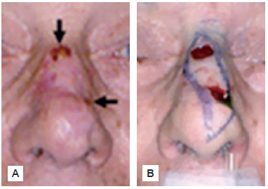 Figura 1 - A: As setas apontam as lesões carcinomatosas nas extremidades da área discrômica no terço médio do nariz; B: A marcação retangular da área discrômica e os triângulos envolvendo os tumores permitiram o fechamento da ferida operatória em linha quebrada. A demarcação foi acrescida em 0,3 cm além dos limites das margens tumorais.