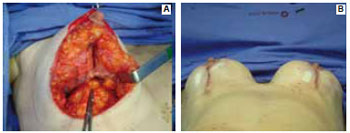 Figura 7 - A: Síntese dos pilares medial e lateral para montagem do parênquima mamário; B: Pós-operatório imediato de mamoplastia vertical com retalho dermolipoglandular de parede torácica.