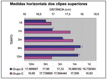Figura 14 - Evolução temporal da distância horizontal dos clipes superiores. Grupo C: grupo de estudo; Grupo S: grupo controle; 1d, 1m, 3m, 6m e 12m: radiografias do 1o dia, 1o mês, 3o mês, 6o mês e 12o mês pós-operatório, respectivamente; *: valores com p<0,05 em relação a 1d.