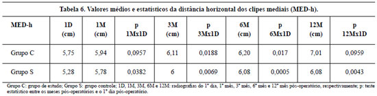 Os padrões de movimentação horizontal (lateralização) dos clipes nos dois grupos puderam ser avaliados e comparados nas Tabelas 5 a 7 e Figura 14 a 16. Os clipes superiores do grupo C apresentaram lateralização estatisticamente significativa somente aos 6 meses pós-operatórios, enquanto no grupo S isto foi observado em todos os tempos estudados (p<0,05) e com valores progressivamente maiores até o 6º mês pós-operatório (Tabela 5 e Figura 14). De forma semelhante, os clipes mediais (Tabela 6 e Figura 15) apresentaram lateralização estatisticamente significativa em todos os tempos do grupo S, e aos 3 e 6 meses pós-operatórios no grupo C. Os clipes laterais (Tabela 7 e Figura 16) demonstraram aumento da distância lateral (p<0,05) em ambos os grupos, em praticamente todos os tempos pós-operatórios, exceto no 12o mês pós-operatório do grupo C (p>0,05), apesar da nítida diferença gráfica.