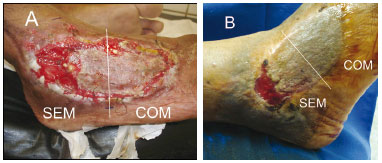 Figura 4 - A: Ferida a ser tratada com enxerto de pele e injeção de PRP no lado esquerdo. B: Pós-operatório. Houve boa integração do enxerto na área onde se utilizou o PRP e má integração na parte onde não se utilizou o produto.