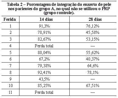 Podemos utilizar o plasma rico em plaquetas (PRP) para repor os FC e estimular a cicatrização dos enxertos. Em estudo anterior, demonstramos o benefício do PRP na integração de enxertos de pele em coelhos, o que incentivou seu uso em enxertos de pele em humanos6. Pelo fato de ser autólogo, não existe contraindicação para sua utilização. Seu preparo, apesar de não ser tão simples como postulado em alguns artigos e conferências, pode ser feito por um técnico treinado7,8.