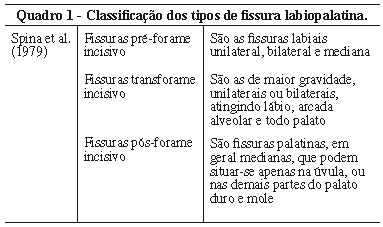 Várias são as classificações utilizadas para tipificar as fissuras labiopalatinas; entretanto, a mais utilizada pelos profissionais é a classificação de Spina (Quadro 1).