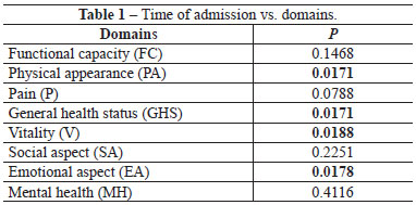 The original sample showed significant results regarding the SF-36 instrument QoL domains. Domains that had lower averages were PA, EA, and P, implying that these domains were the most impaired during hospitalization.