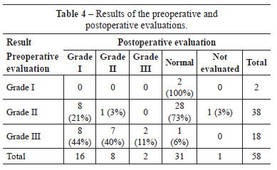 Fifty-six patients were classified preoperatively with McGowan's4 Grade II and Grade III compression (Table 1). These patients presented preoperative sensory and motor objective alterations and constriction of the nerve at the cubital tunnel during surgery. Of 9 patients diagnosed with leprosy, 8 presented with Grade III compression.