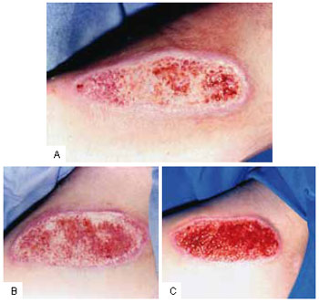 Figura 2 - A: Úlcera crônica do membro inferior direito com intenso depósito de fibrina e edema no leito do tecido de granulação. B: Diminuição do edema com recuperação do tecido de granulação após a quinta sessão da infusão controlada do CO2. C: Tecido de granulação apto a receber o enxerto autólogo de pele após dez sessões.