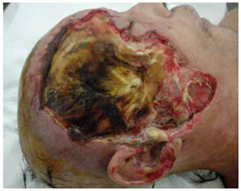 Figura 1 - Paciente diagnosticado com fasciíte necrotizante, préoperatório. Nota-se debris necróticos na área cruenta pré-auricular e alteração discrômica da pele na região fronto-temporal.