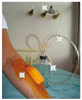 Figura 6 - Elementos necessários para compor o curativo a vácuo: 1. Válvula estabilizadora de pressão negativa - Vácuo USP - conectado a vácuo hospitalar; 2. Mangueira de conexão entre a válvula, a esponja e o coletor; 3. Coletor; 4. Campo cirúrgico iodoforado - Ioban® isolando a esponja conectada ao vácuo, sobre a ferida a ser tratada.