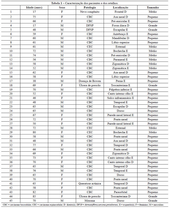 Em uma análise retrospectiva, realizada entre julho de 2004 e agosto de 2010, foram identificados 42 pacientes submetidos a 45 reconstruções teciduais com retalhos bilobados empregados para tratamento de lesões de etiologia distinta (Tabela 1).