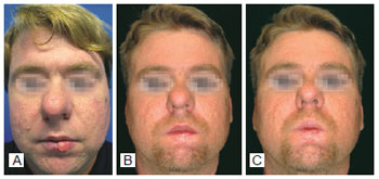 Figure 8 - In A, preoperative aspect. In B and C, postoperative result demonstrating labial containment.